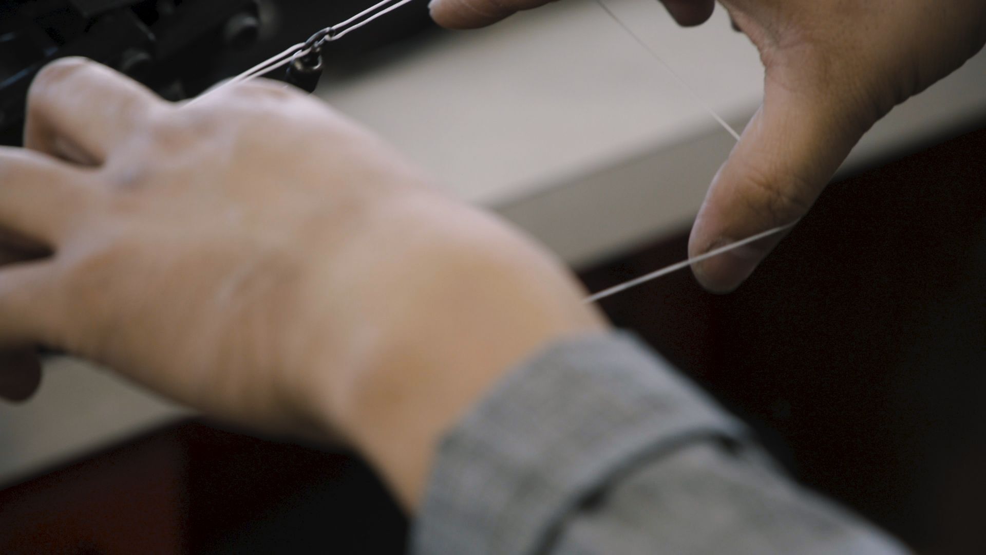 When the line is secured and cinched down, you may begin winding the line onto the reel, helping guide how the line is applied. Apply approximately 725 yards of line, stop, then put another 75 yards on to make the 225 foot marker. Once the line is applied, you will anchor it down, and grab your 70 pound rigging floss. Pull off about 4 feet of rigging floss and double it up, making sure to have the ends offset for ease of pulling apart later. Grab the center and loop it onto the line to serve as an anchor point.