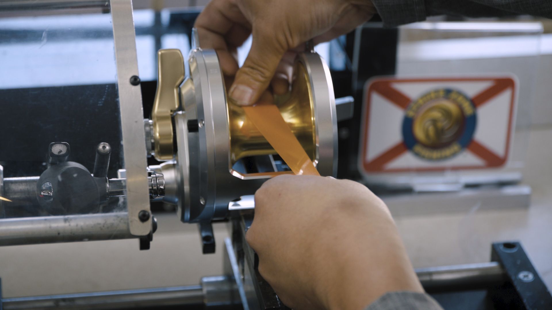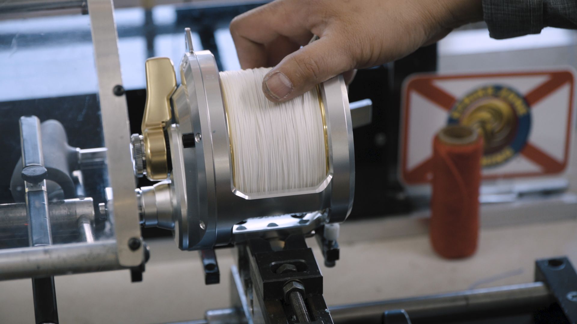 A question we often receive is ‘how do you mark your reels to properly stagger out your lines?’ When spooling line on to the reel, Archie recommends, “you want to start with securing the line on to the reel with silicone tape.” The line winder being used is the omega gear line winder, which puts a tremendous amount of pressure, around 400 PSI (pounds per square inch), on the line to avoid line digging. The line winder is controlled by a pneumatic pressure pump. The demonstration is with the Talica 50 II speed from Shimano. The reel has over 60 pounds of drag and holds approximately 800 yards of 130 pound braided line. After applying the silicone tape, wrap the line around the spool a few times, and pull the tag end up. With the tag end tie a Uni-knot.